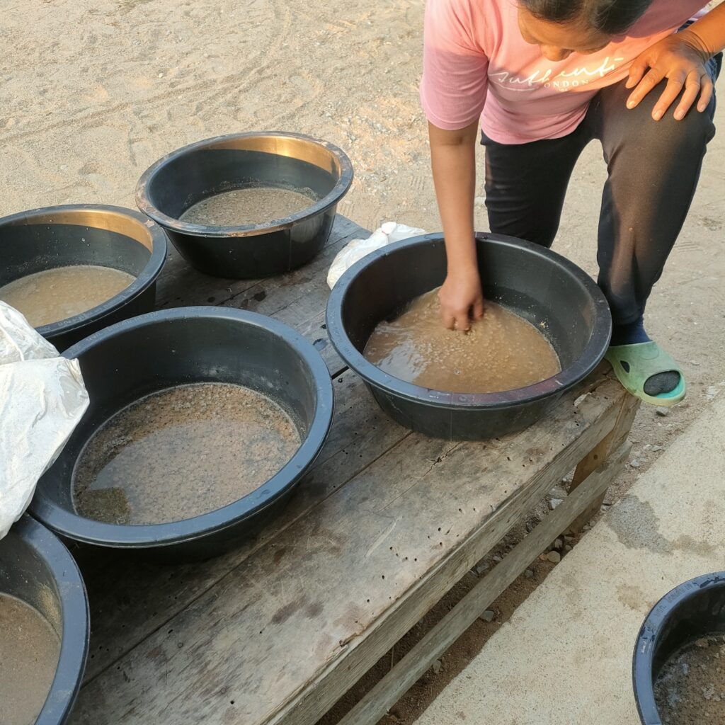 2. ใช้หัวอาหาร 1 กระป๋องล้นนิดหน่อย (น้ำหนักน่าจะ 1 ขีด) ใส่กะละมัง ตามด้วยน้ำ 1 ขัน เพื่อละลายเม็ดอาหารพอเปื่อยๆ