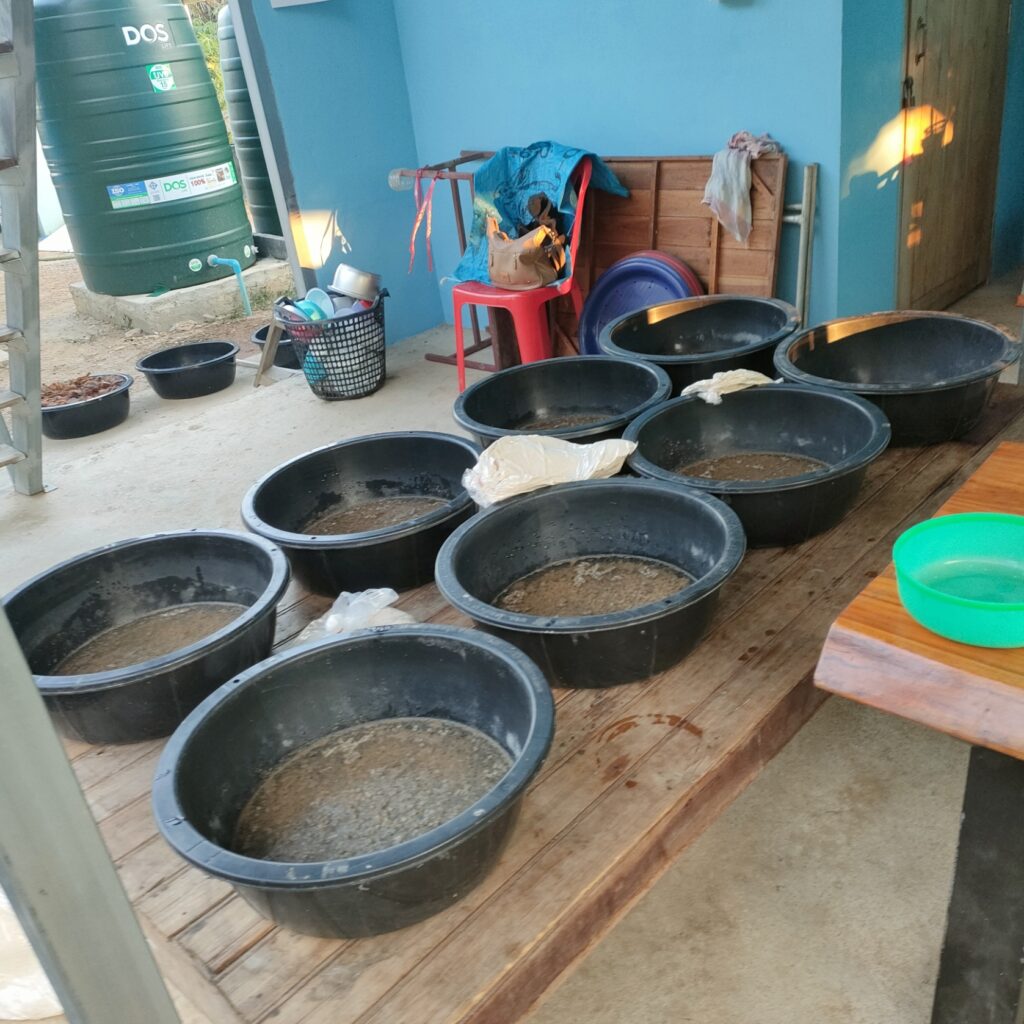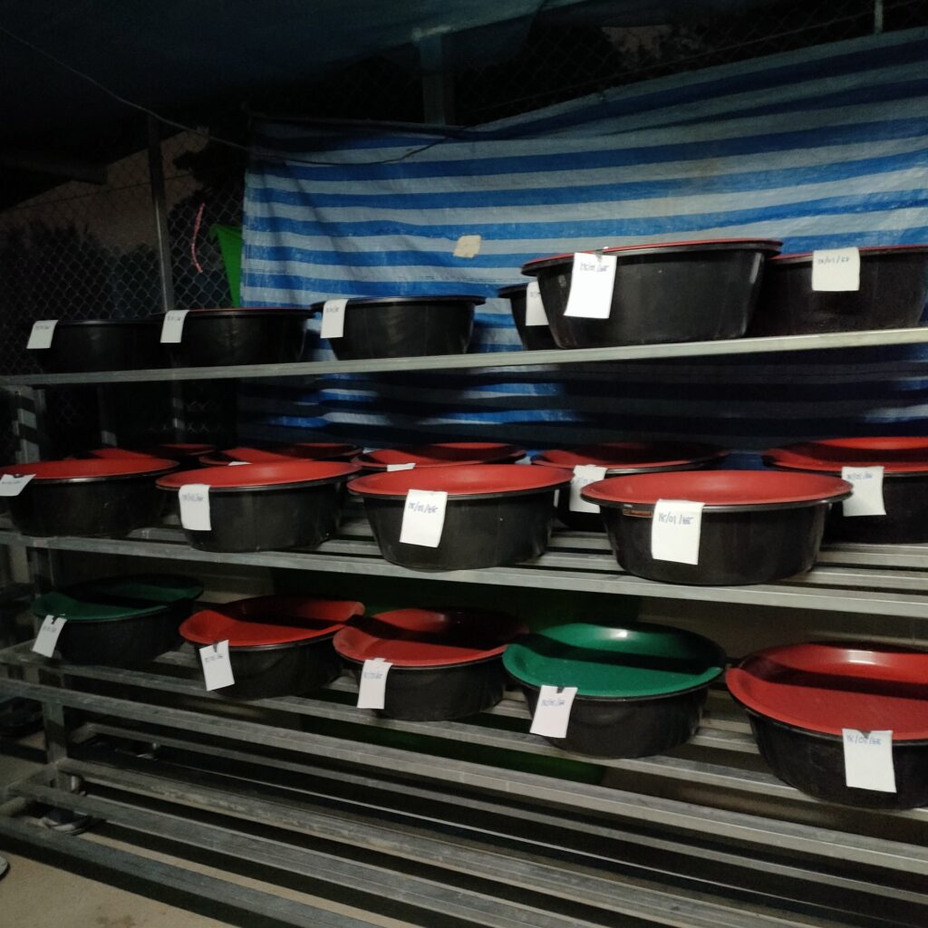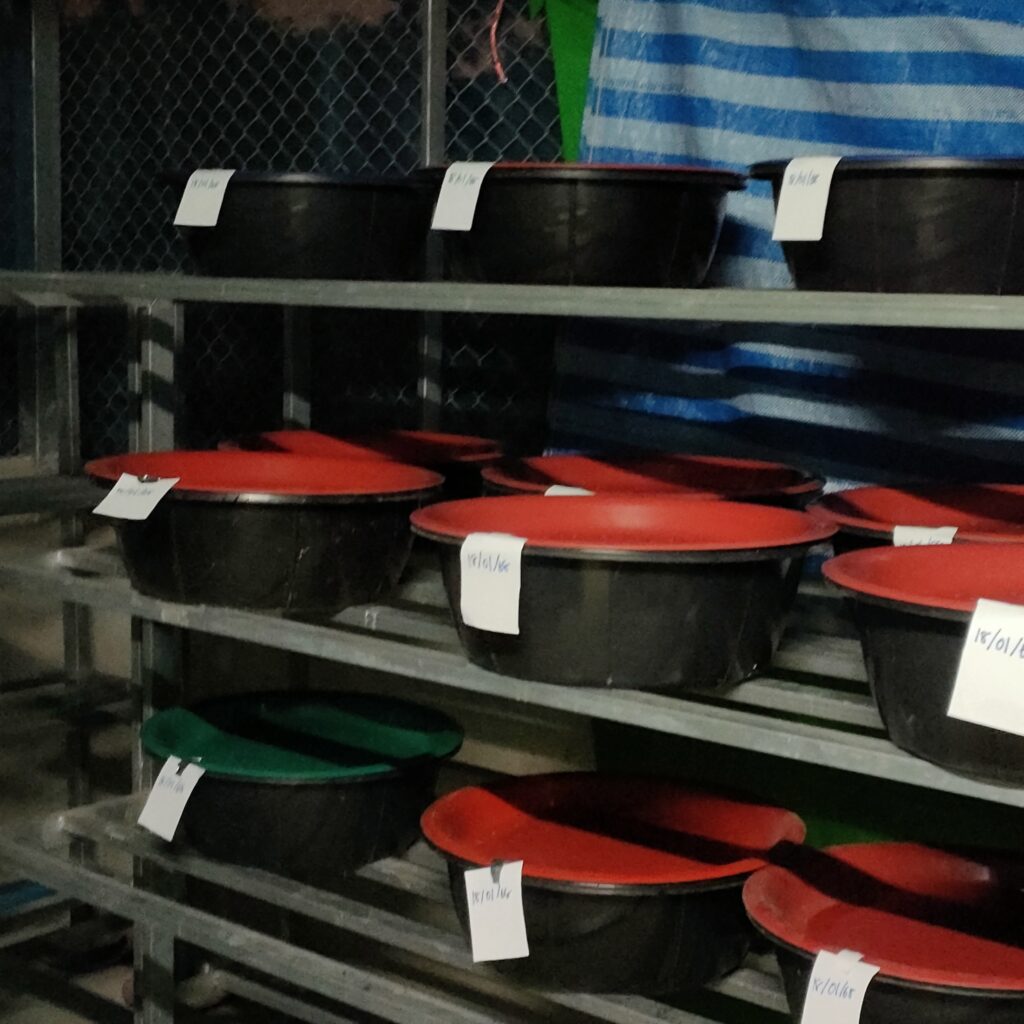 6. นำกะละมังเพาะเลี้ยงไปวางในชั้น รอ 15 วัน เอาพ่อแม่พันธ์ุออก