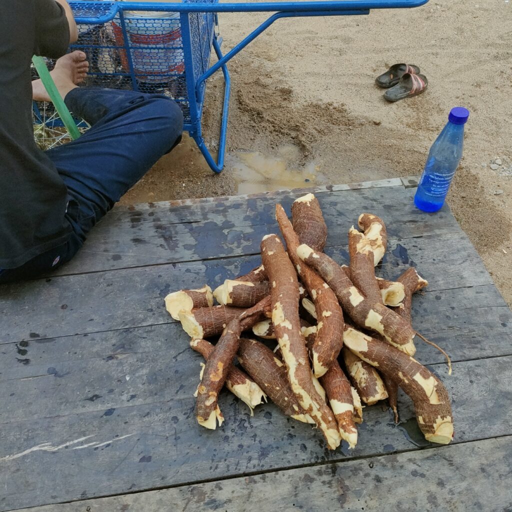 1. หัวมันสำปะหลัง ปลูกไว้ประมาณ 1 ปี หัวใหญ่มาก แล้วก็ใช้ 2 มือ 3 แรงคน ขุด ขุด ขุด เหนื่อยมากก