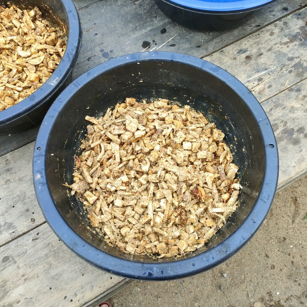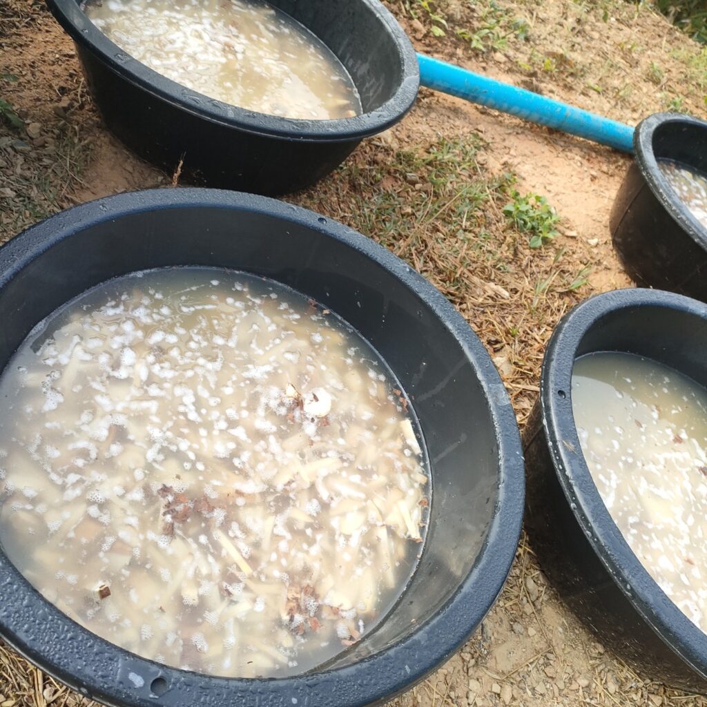 2. เราวางน้ำหนักหัวมันสับตากแห้ง กะละมังละ 1 กก. (ชั่งตอนแห้งก่อนแช่น้ำ) พอเทน้ำออกแล้วจะได้ออกมาแบบนี้