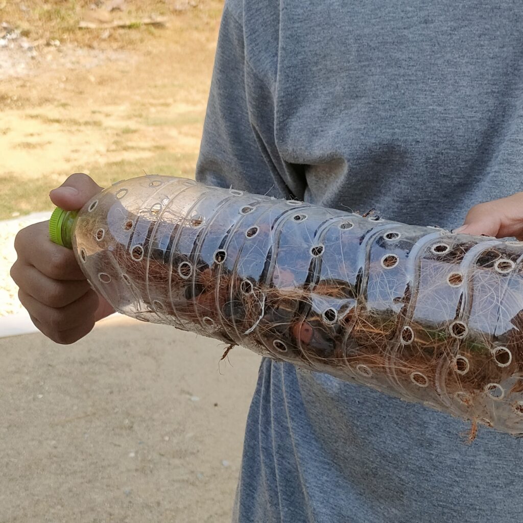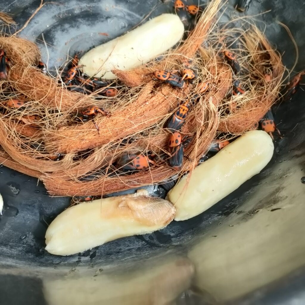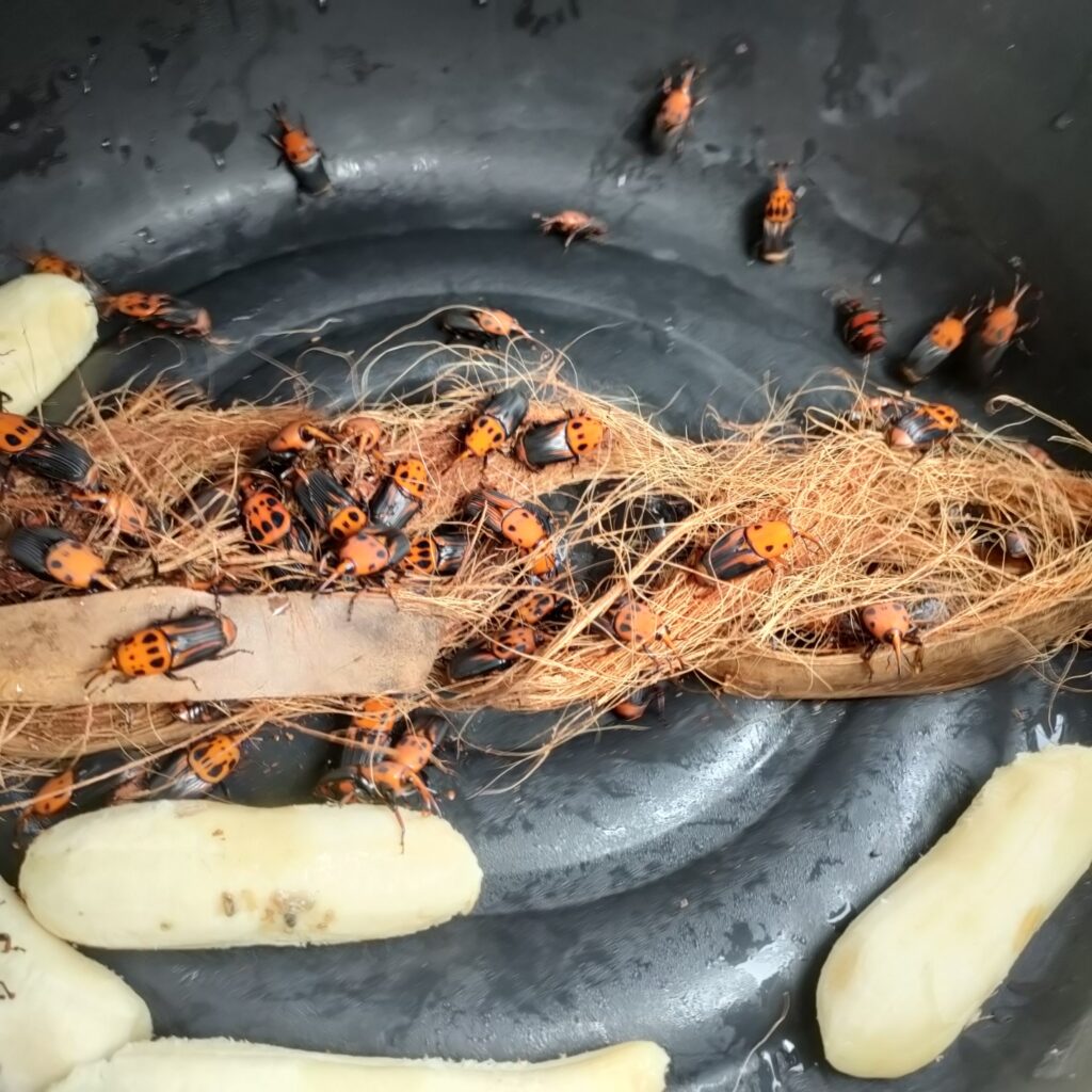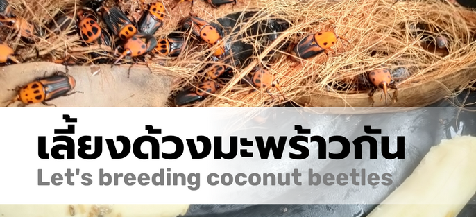4. วางกาบมะพร้าวสับไว้ด้านบนให้พอทั่ว จากนั้นปล่อยพ่อแม่พันธ์ุ 5 คู่ในแต่ละกะละมัง รีบปิดฝาถาดด้วยล่ะ กล้วยที่ให้พ่อแม่พันธ์กินก็โยนเข้าไปได้ ชิ้นสองชิ้น