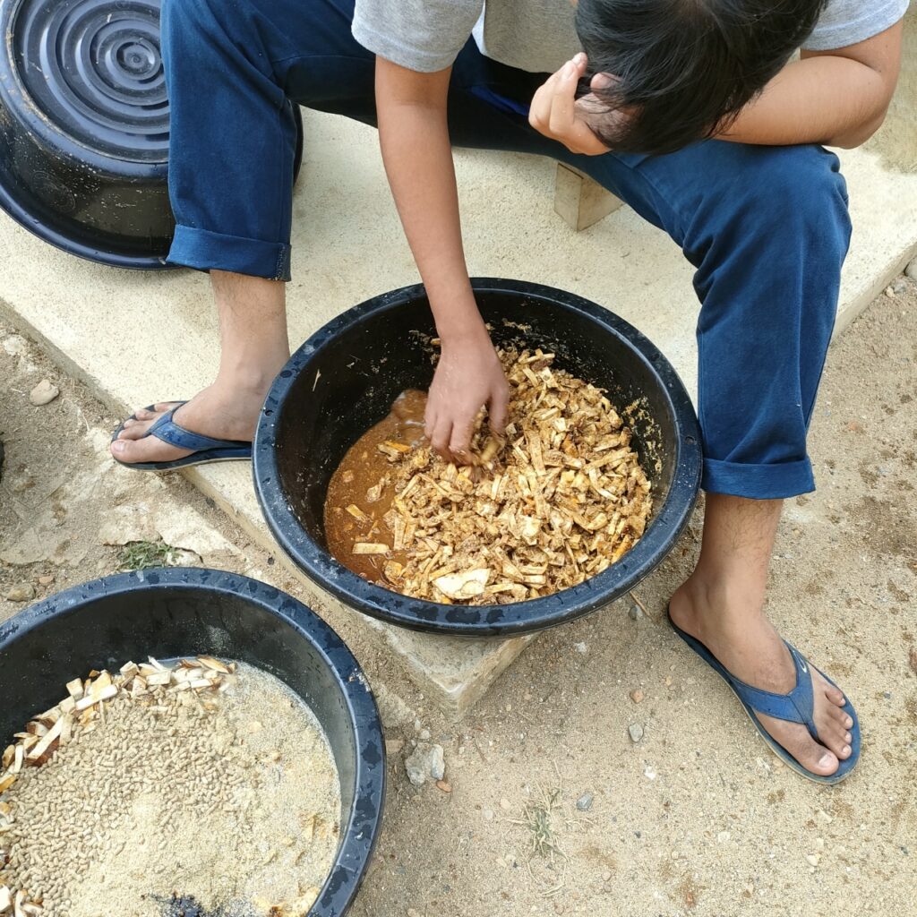 3. ใช้หัวอาหาร 1 กระป๋องล้นนิดหน่อย (น้ำหนักน่าจะ 1 ขีด) ใส่กะละมัง + รำข้าวละเอียด 1 ถ้วย + น้ำ EM เพิ่มจุลินทรีย์ช่วยย่อยและลดกลิ่น 3 ชต. + ตามด้วยน้ำ 1 ขัน เพื่อละลายเม็ดอาหารพอเปื่อยๆ