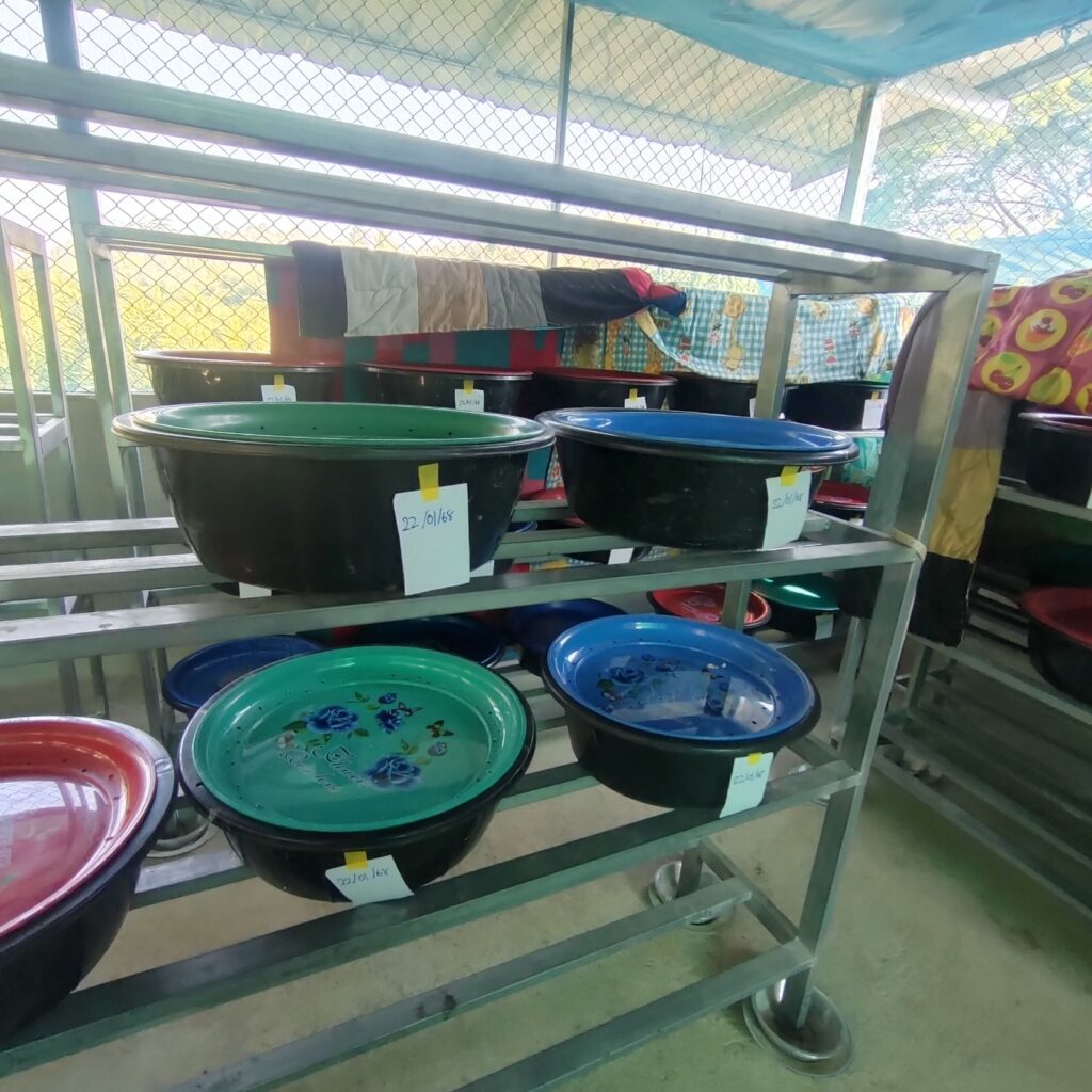 - กะละมังซักผ้า (สีดำทนกว่า) พร้อมถาดวางกับข้าวแบบกลม มาเจาะรูเองดีกว่า